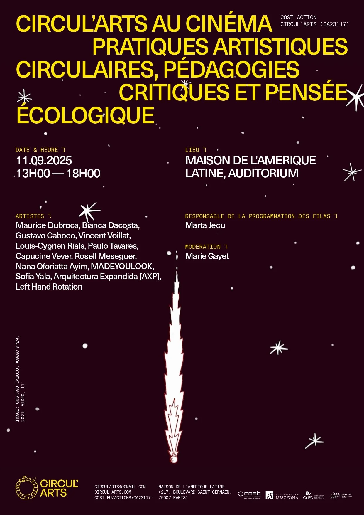 On September 11, from 1:00 PM to 6:00 PM, at the Maison de l'Amérique Latine (Auditorium), Bianca Dacosta will participate in the film screening program as part of the Circul'Arts: Connecting Critical Pedagogies, Inclusive Artistic Processes, and Urban Ecologies event.