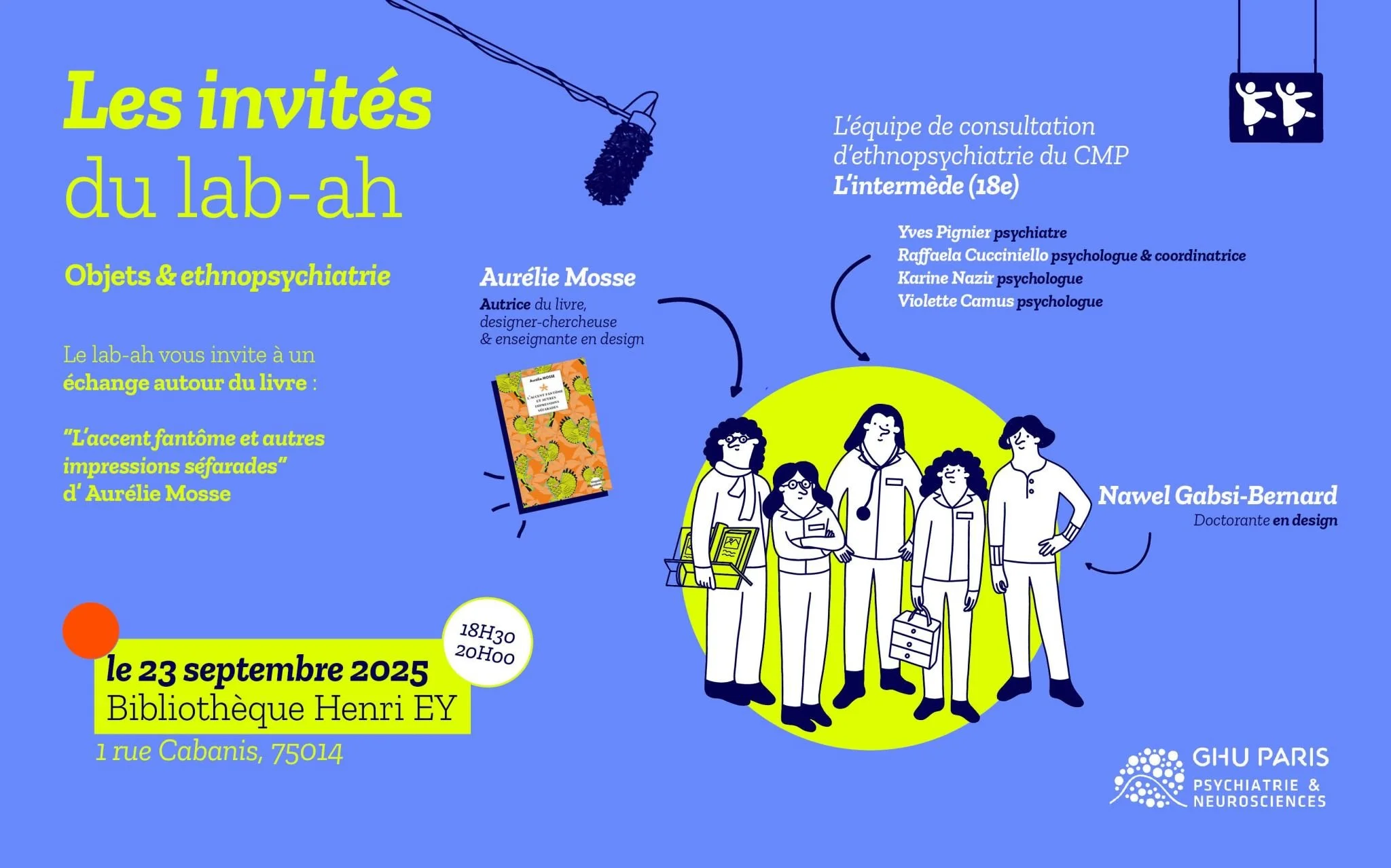 Cet échange se fera en dialogue avec l’équipe de la consultation d’ethnopsychiatrie du CMP l’Intermède du GHU PARIS et de Nawel Gasbi-Bernard, évoquant les relations possibles entre design, mémoire, objets et ethnopsychatrie. Ces échanges seront accueillis par l’équipe de la bibliothèque médicale Henri Ey, 1 rue Cabanis, 75014 Paris.
